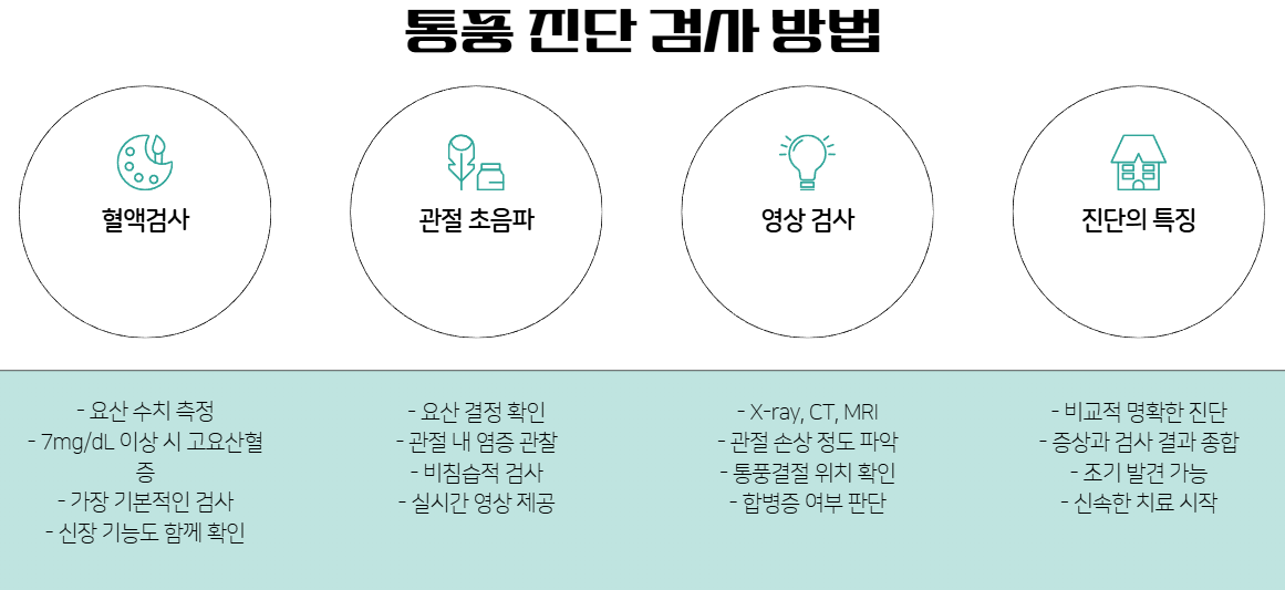 통풍은 비교적 진단이 명확한 질환이다. 혈액검사를 통해 요산 수치를 확인하고, 필요 시 관절 초음파나 영상 검사를 병행한다.