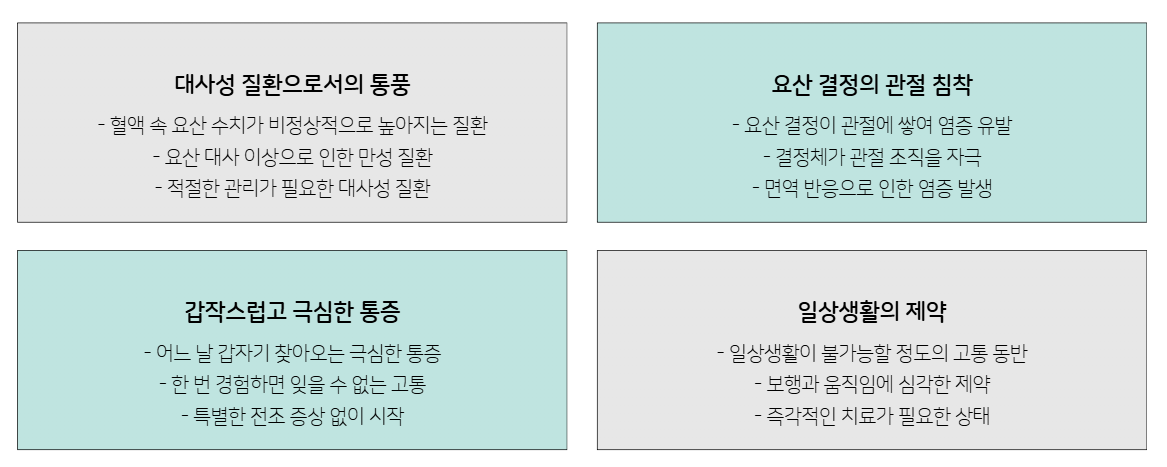 통풍은 단순한 관절 통증이 아니라 혈액 속 요산 수치가 비정상적으로 높아지면서 요산 결정이 관절에 쌓여 염증을 일으키는 대사성 질환이다. 특히 통풍은 어느 날 갑자기 찾아오는 극심한 통증으로 시작되며, 한 번 경험하면 일상생활이 불가능할 정도의 고통을 동반하는 것이 특징이다.