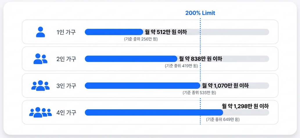 예를 들어 1인 가구라면 월 약 512만 원 이하 수준이면 200% 기준을 충족하게 됩니다.