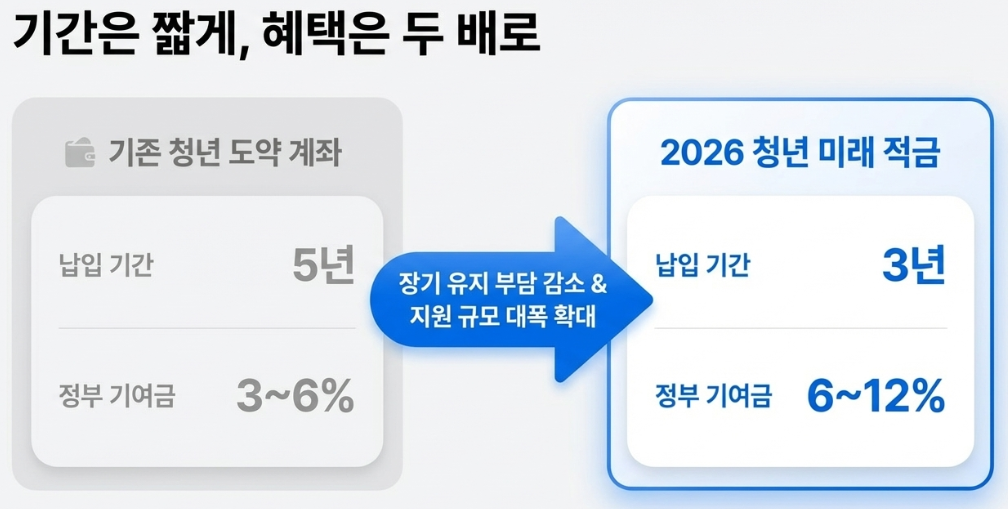 2026년에 새로 도입되는 청년 미래 적금은 기존 청년 도약 계좌(5년)보다