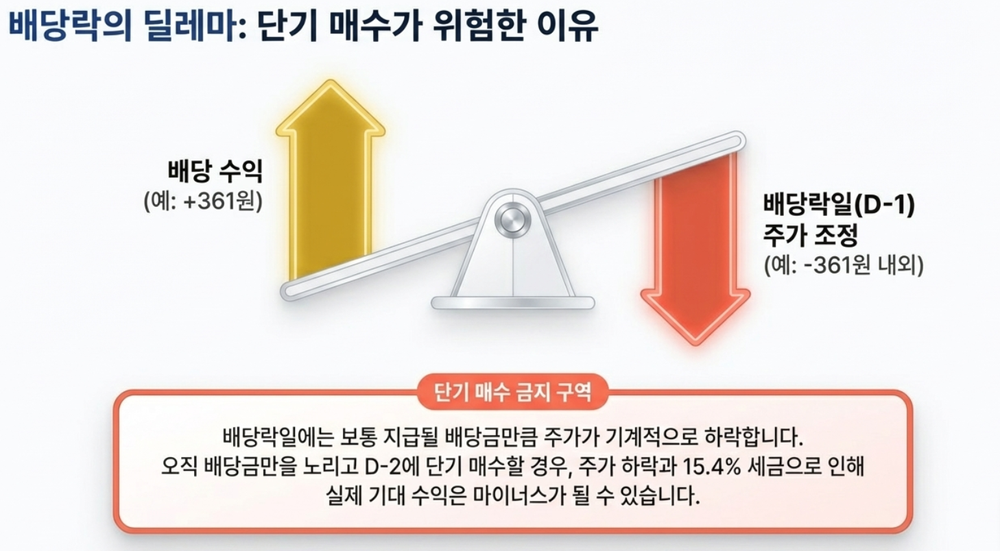 하지만 한국 주식시장에는 배당락일 제도가 있기 때문에 실제 매수 시점이 중요합니다.