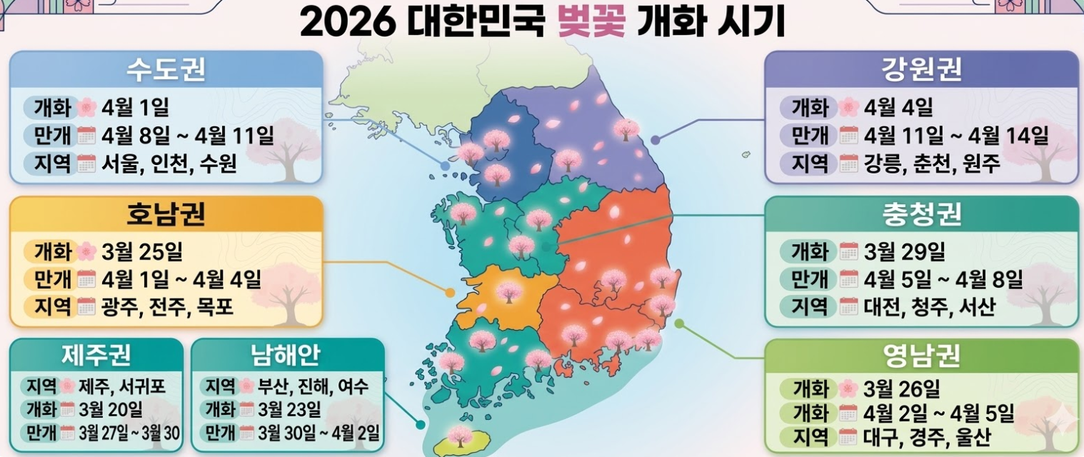 2026년 기준 전국 벚꽃 개화 예상 일정은 다음과 같습니다.
