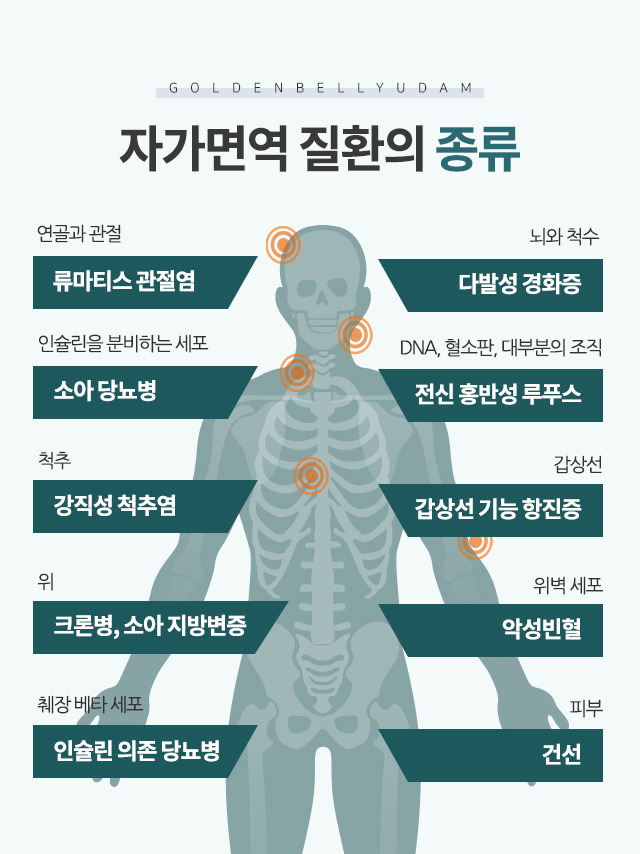 자가면역질환 종류는 관절·전신·내분비·신경계 등 다양한 장기를 침범하는 질환으로 나뉜다.