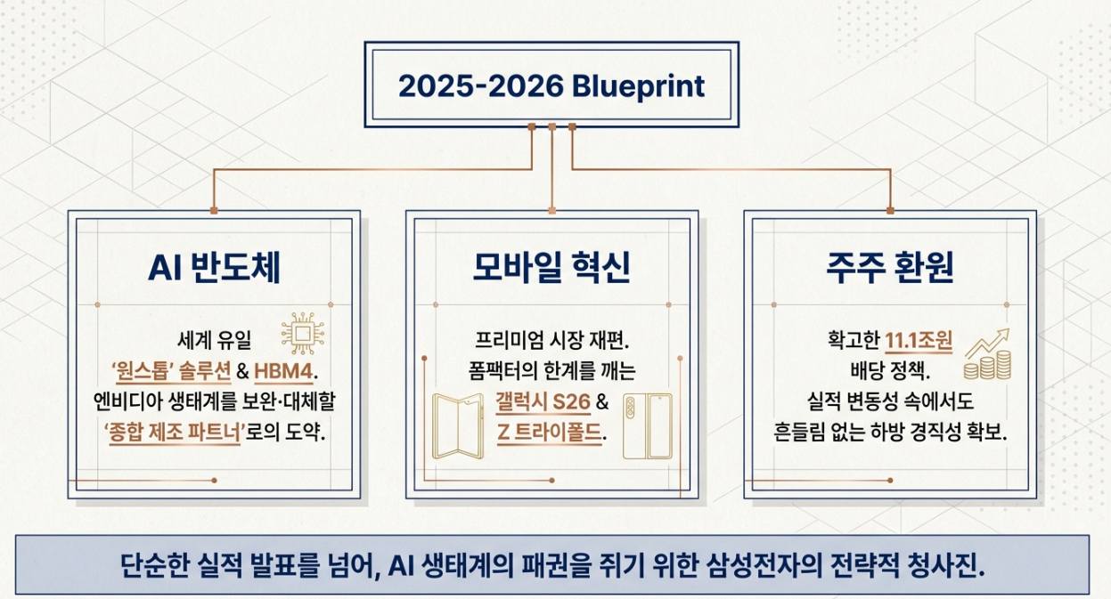 삼성전자 주주총회에서 공개된 AI 반도체 전략, HBM4 메모리, 갤럭시 S26 시리즈, 2025년 배당금 정책은 향후 주가와 기업 경쟁력을 판단하는 핵심 지표입니다. 특히 최근 시장의 관심이 집중된 HBM4·파운드리 경쟁력·주주환원 정책에 대한 방향이 공식적으로 제시됐다는 점에서 투자자라면 반드시 확인해야 합니다.